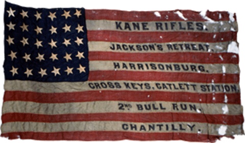 When Kane divided the regiment into two wings, the banner was carried by Kane’s four companies into the Shenandoah Valley. This detachment engaged Jackson’s troops at Harrisonburg on June 6th 1862, at Cross Keys on June 8th, and again at Cedar Mountain on August 9th. The detachment was present at Cattle’s Station when the famed Rebel cavalry leader JEB Stuart raided General Pope’s headquarters there on August 22nd. Kane’s men attacked during the night and succeeded in driving off the Rebel raiders before more damage was done to Pope’s wagon train.